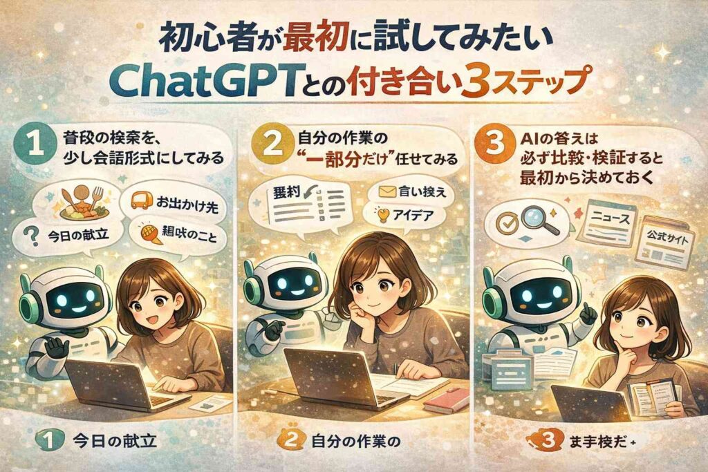 最後に、かつての私と同じように「AIがちょっと怖い」と感じている人向けに、最初の一歩の踏み出し方を3ステップでまとめておきます。