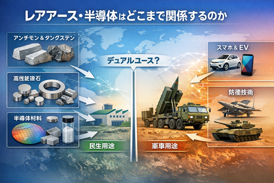 希土類磁石や半導体関連材料は高度産業の基盤であり、用途によっては軍民両用になり得ます。