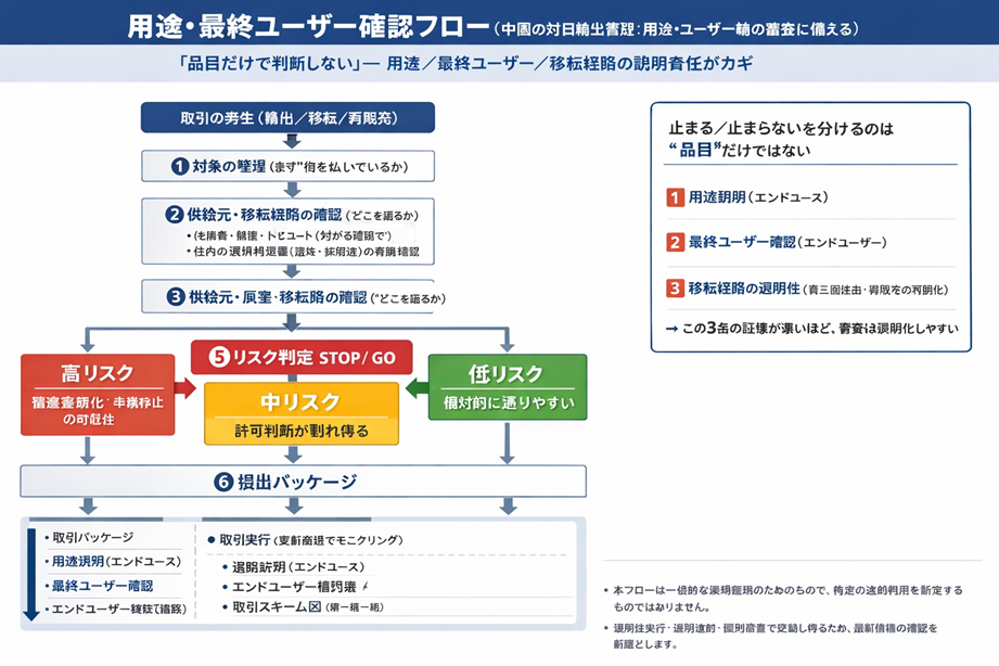 重要なのは、民生向け最終製品であっても、部材・用途・最終ユーザー評価(エンドユーザー確認)次第で審査が長期化したり、手続きが止まり得る点です。